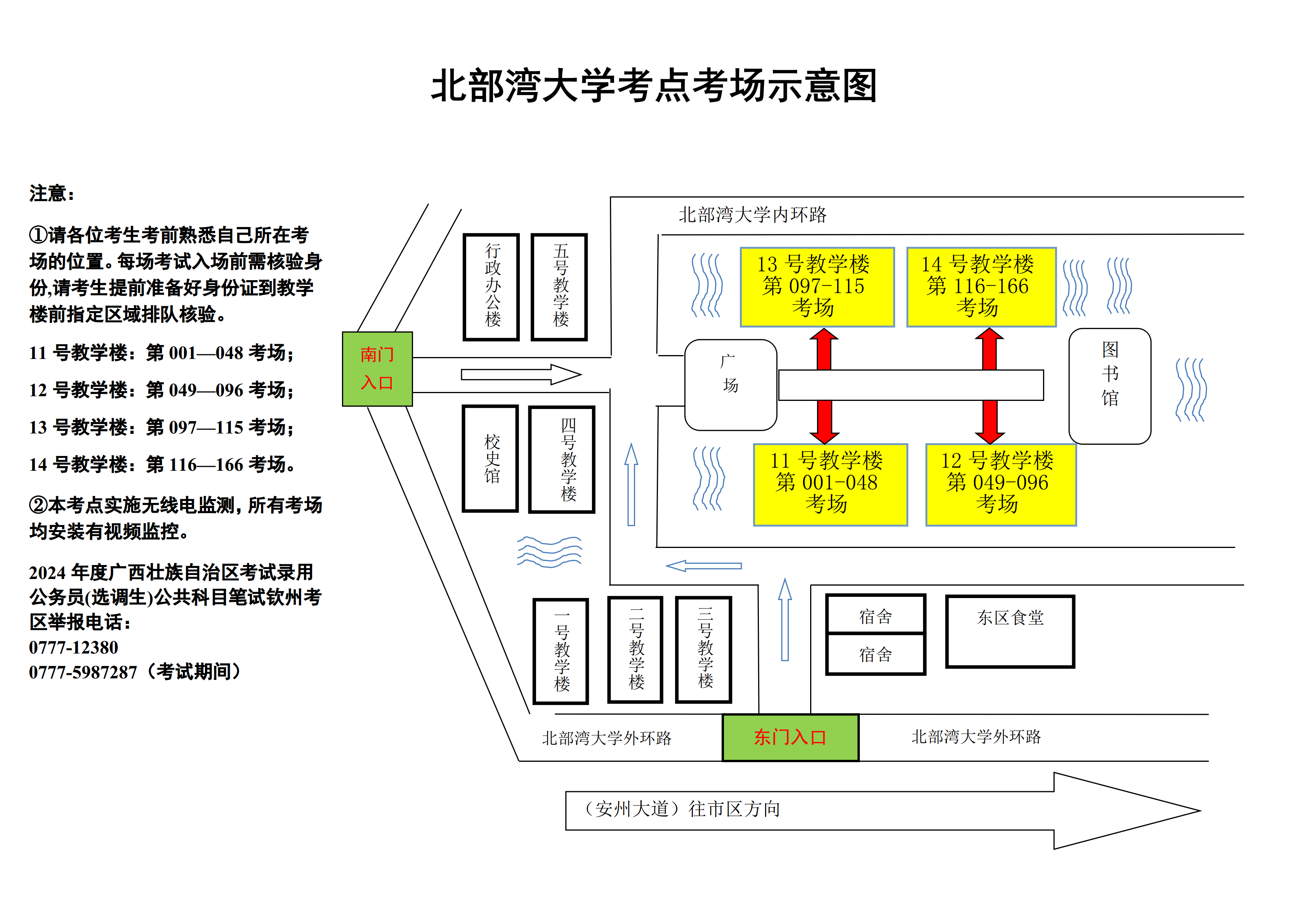 欽州考區(qū)共設兩個考點,分別為北部灣職業(yè)技術學??键c和北部灣大學考點。請核對好本人準考證上的考點,兩個考點離市區(qū)有一定距離,請關注當天天氣情況,充分考慮路途時間和天氣因素影響,每場考試前,提前60分鐘到達考點。(考點地址和具體考場安排請掃附后的二維碼查看)