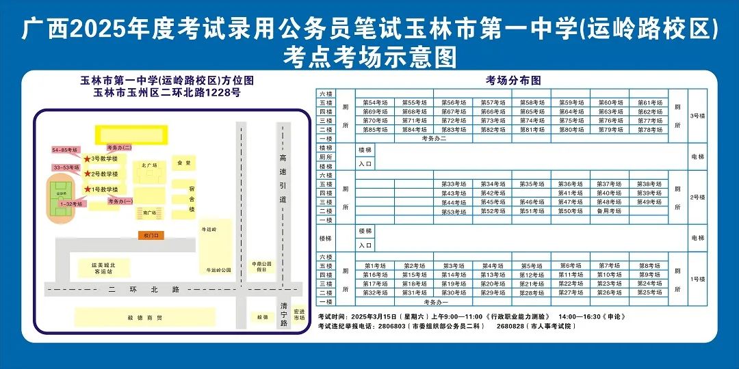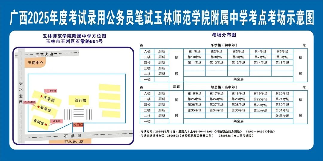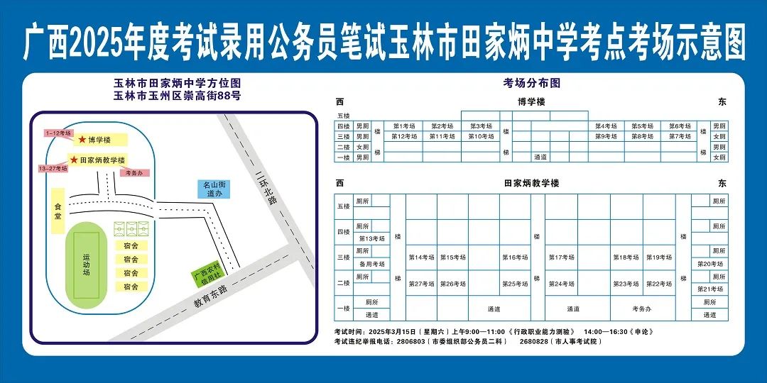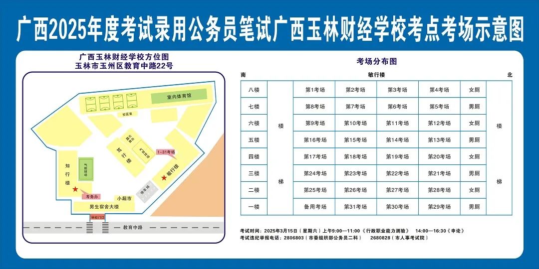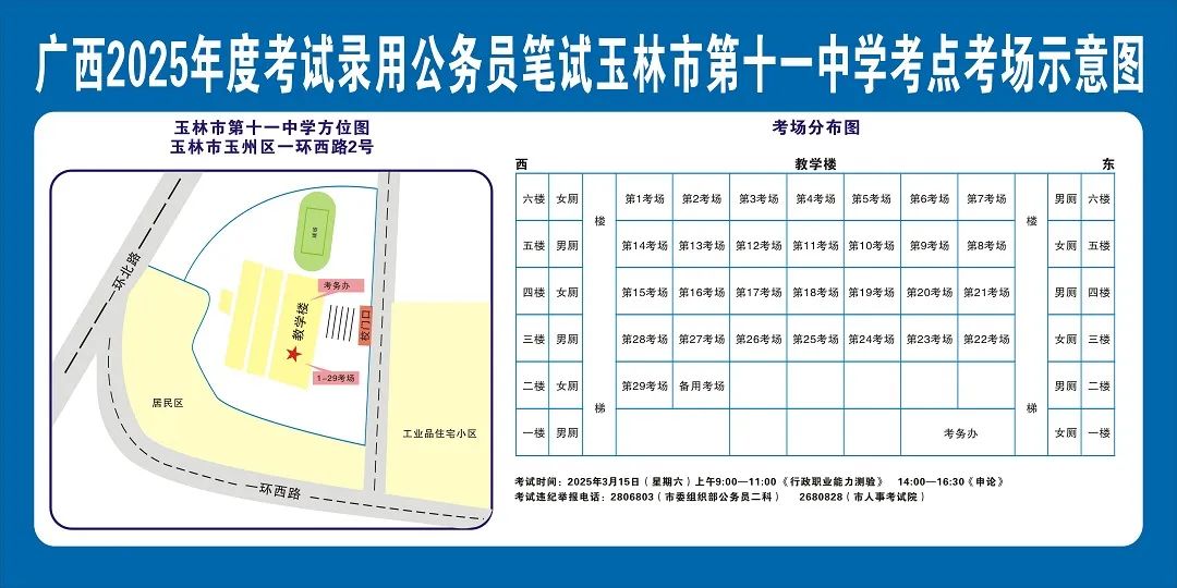 除考試當(dāng)天考生可以進入考點外,考生不得提前進入考點查看考場(學(xué)校將在大門處擺放考場分布示意圖),玉林考區(qū)11個考點的考場布置情況如下: