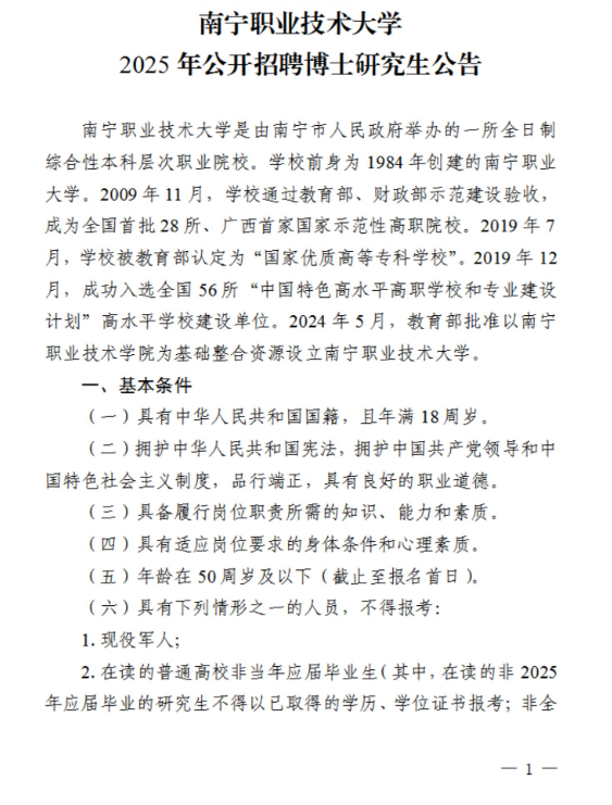 2025年南寧職業(yè)技術(shù)大學(xué)公開招聘博士研究生公告
