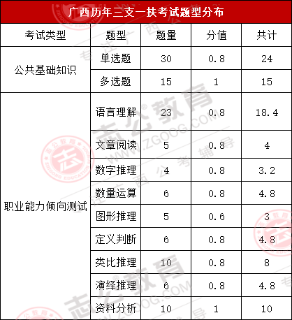 上篇我們寫(xiě)到,三支一扶的待遇,在廣西這個(gè)待遇還算不錯(cuò),政策上的支持也非常好,那么預(yù)計(jì)這個(gè)月月底出公告的三支一扶,啥時(shí)候筆試呢?2024年廣西三支一扶筆試時(shí)間是7月13日,其筆試科目為《綜合知識(shí)》一科,滿(mǎn)分100分。基于往年考生的回憶,綜合知識(shí)內(nèi)容主要包括公共基礎(chǔ)知識(shí)和行測(cè)職業(yè)能力測(cè)試兩個(gè)科目,而各題型的題量及分值如下圖所示: