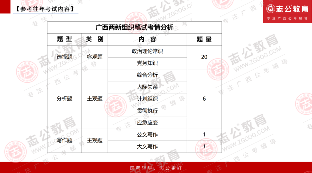 綜合能力素質(zhì)測試,分值為100分。但是我們志公教育教研團隊仍能大致大家劃分備考范圍,大家參考一下: