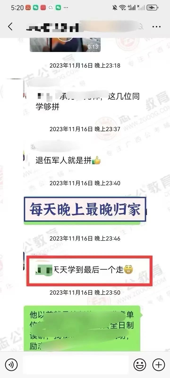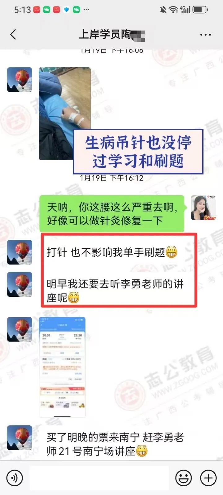 在備考的日子里,無(wú)數(shù)個(gè)夜晚,我看到他朋友圈發(fā)的經(jīng)常學(xué)習(xí)練習(xí)到教室關(guān)門最后一個(gè)才回家,無(wú)數(shù)次往返南寧和桂林兩座城市,只為家庭和研究生學(xué)業(yè)和公務(wù)員備考的有序進(jìn)行,讓我印象最深的一次,就是他微信拍了一張正在打針輸液的照片發(fā)給我,還打趣的跟我說(shuō):還好不影響我單手刷題! 即使學(xué)員因?yàn)樯眢w過(guò)于勞累導(dǎo)致生病在吊針,也絲毫沒(méi)有懈怠過(guò)學(xué)習(xí),讓我非常的佩服和感動(dòng)。