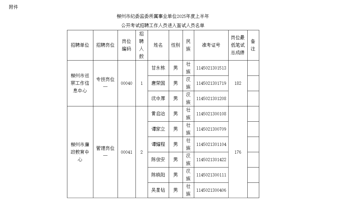 (二)面試崗位:詳見附件《柳州市紀委監(jiān)委下屬事業(yè)單位2025年度上半年公開考試招聘工作人員進入面試人員名單》。