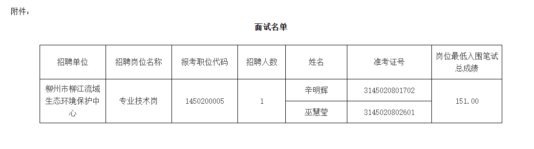 (三)成績公布:面試成績將于面試結(jié)束后當天在柳州市生態(tài)環(huán)境局一樓公示欄進行公示,并同步發(fā)布于柳州市生態(tài)環(huán)境局網(wǎng)站(http://sthjj.liuzhou.gov.cn),請考生自行查看。