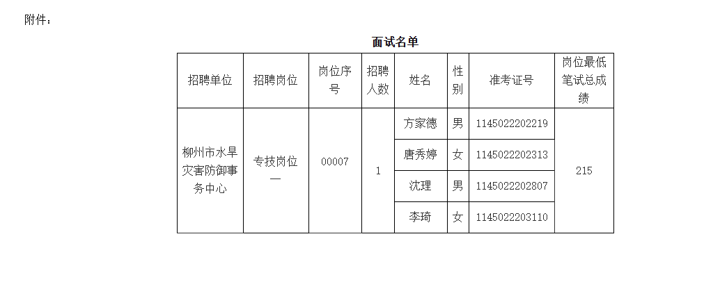 根據(jù)《柳州市2025年度上半年事業(yè)單位公開(kāi)考試招聘工作人員公告》《廣西壯族自治區(qū)事業(yè)單位公開(kāi)招聘人員實(shí)施辦法》(桂人社發(fā)〔2011〕155號(hào))、《關(guān)于印發(fā)<廣西壯族自治區(qū)事業(yè)單位公開(kāi)招聘工作人員面試工作規(guī)則(試行)>的通知》(桂人社發(fā)〔2012〕79號(hào))的規(guī)定,柳州市水利局?jǐn)M組織所屬事業(yè)單位公開(kāi)招聘工作人員面試,現(xiàn)將相關(guān)事宜公告如下: