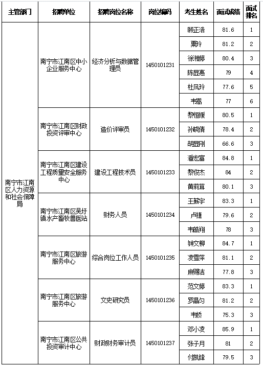 南寧市江南區(qū)人力資源和社會保障局2025年公開考試招聘事業(yè)單位工作人員面試成績表
