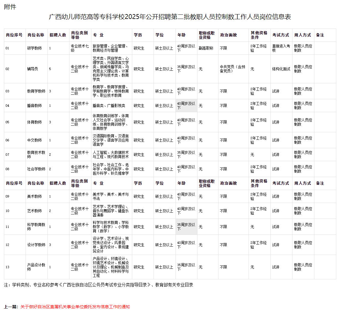 本次公開(kāi)招聘工作人員26名,具體招聘崗位及要求詳見(jiàn)《廣西幼兒師范高等專(zhuān)科學(xué)校2025年公開(kāi)招聘第二批教職人員控制數(shù)工作人員崗位信息表》(附件)。