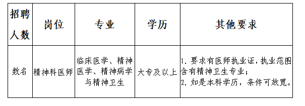 根據(jù)業(yè)務(wù)發(fā)展需要,持續(xù)加強(qiáng)我市心理健康和精神衛(wèi)生服務(wù)能力建設(shè),更好地滿足我市廣大人民群眾看病就醫(yī)需求,我院特面向社會公開招聘數(shù)名編制外聘用工作人員,現(xiàn)將有關(guān)事項(xiàng)公告如下: