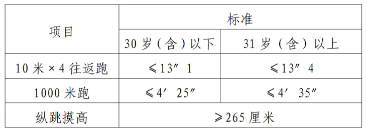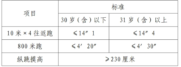 體能測評項目中,縱跳摸高的測試次數(shù)不超過3次,10米×4往返跑測評次數(shù)為2次,1000米/800米的測評次數(shù)均為1次。應(yīng)聘勤務(wù)崗位的人員,體能測評三項全部達(dá)標(biāo)的方為合格;應(yīng)聘文職崗位的人員,體能測評三項有兩項達(dá)標(biāo)的,視為合格。