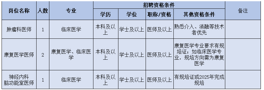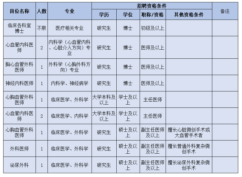 ③列入醫(yī)院人才引進(jìn)目錄或醫(yī)院根據(jù)??瓢l(fā)展需要的崗位人才,人才資格條件按特殊情況辦理,采用一人一議。