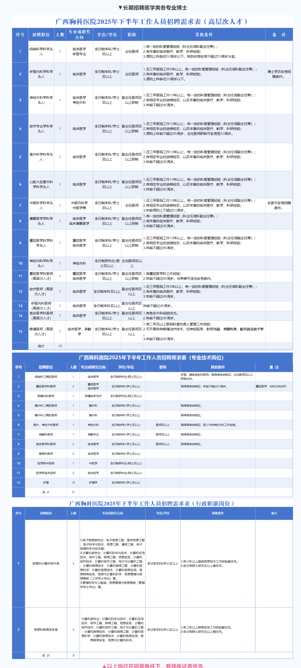 2.網(wǎng)上報名:請將招聘報名表及個人信息匯總表(詳見附件)、個人簡歷、身份證、學(xué)歷學(xué)位證、大學(xué)英語四六級考試成績報告單、在校期間成績單、資格證、執(zhí)業(yè)證、住院醫(yī)師規(guī)范化培訓(xùn)合格證、獲獎證書電子版打包發(fā)送到廣西壯族自治區(qū)胸科醫(yī)院人事科郵箱gxltyyrsk@126.com。郵件統(tǒng)一命名格式為“崗位+學(xué)歷+姓名”,例如:“呼吸內(nèi)科醫(yī)師+全日制本科+姓名”。