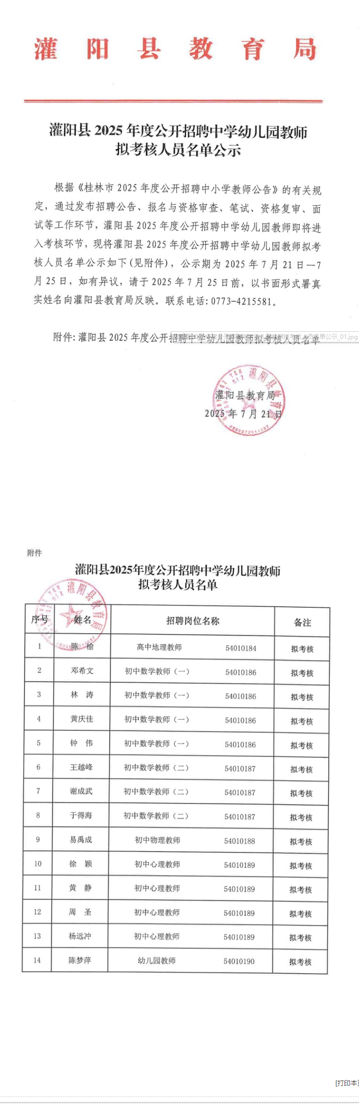 灌陽(yáng)縣2025年度公開(kāi)招聘中學(xué)幼兒園教師擬考核人員名單公示