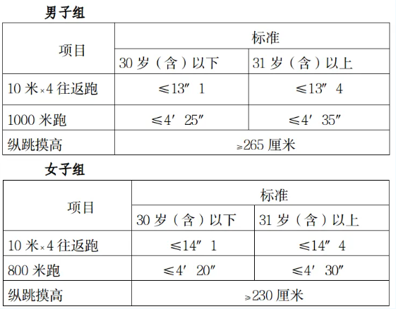 2.體測項目和標準。參照《關(guān)于印發(fā)公安機關(guān)錄用人民警察體能測評項目和標準(暫行)的通知》(人社部發(fā)〔2011〕48號)的項目及測試規(guī)則,結(jié)合《公安民警體育鍛煉達標手冊》成績標準,本次體能測評的項目和標準如下: