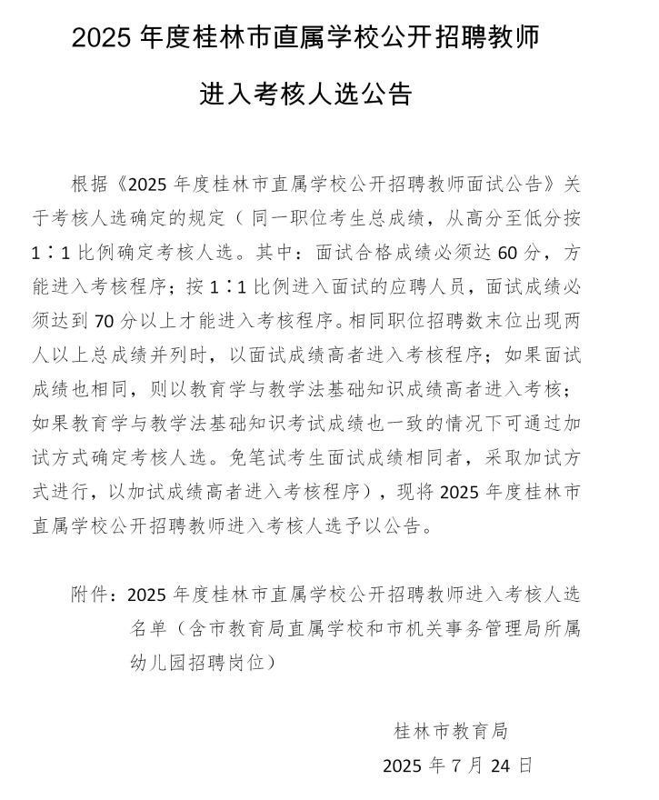 2025年度桂林市直屬學(xué)校公開招聘教師進(jìn)入考核人選公告