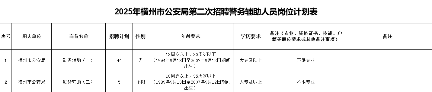 附件1.橫州市公安局2025年度第二次公開招聘警務(wù)輔助人員崗位計(jì)劃表