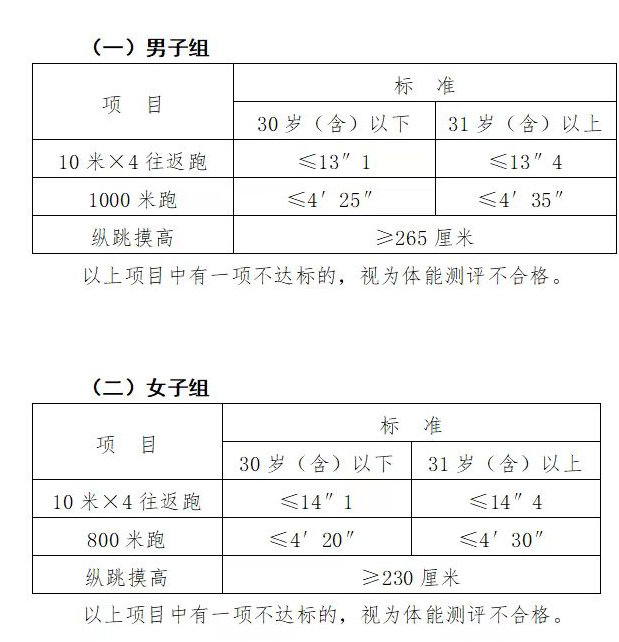 體測項(xiàng)目為縱跳摸高、10米×4往返跑和1000米(男)或800米(女)長跑,體能測試項(xiàng)目評分標(biāo)準(zhǔn)依據(jù)《公安機(jī)關(guān)錄用人民警察體能測評項(xiàng)目和標(biāo)準(zhǔn)(暫行)》執(zhí)行(見附件3),體能測試項(xiàng)目規(guī)則按照《公安機(jī)關(guān)錄用人民警察體能測評實(shí)施規(guī)則》執(zhí)行(見附件4)。