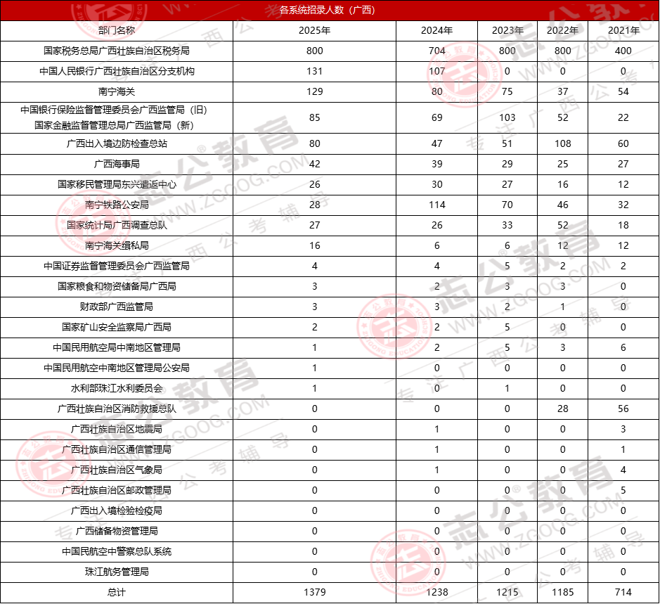 國家稅務(wù)總局廣西壯族自治區(qū)稅務(wù)局常年占據(jù)招錄首位,2025年以376個(gè)崗位、800人的招錄規(guī)模,占廣西總招錄人數(shù)的58%。此外,海關(guān)系統(tǒng)對廣西考生較為友好,平均入面分?jǐn)?shù)約117分,比稅務(wù)系統(tǒng)低5分以上,且常面向冷門專業(yè)招錄,可作為特色選擇。