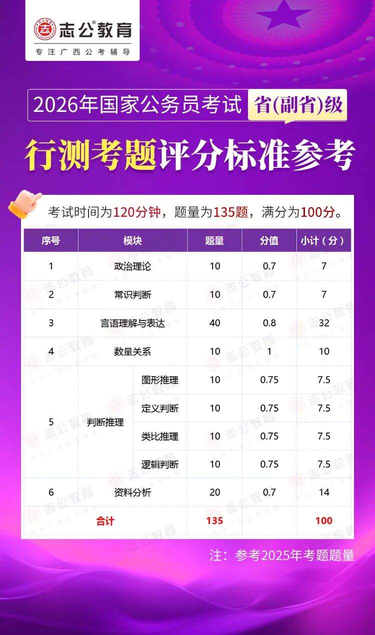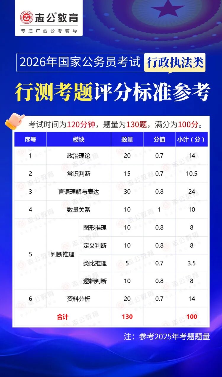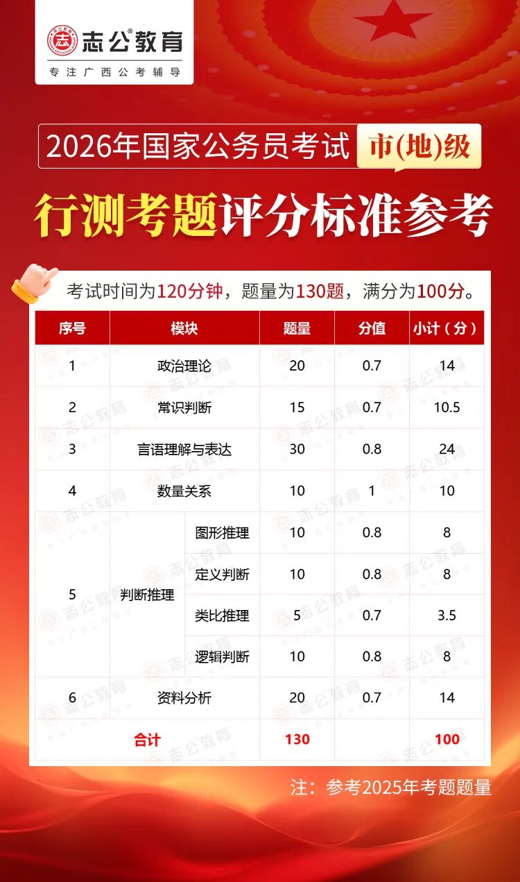 無論報(bào)名人數(shù)是否會增加,提升自身實(shí)力才是應(yīng)對2026年國考的關(guān)鍵。行測作為國考公共科目筆試的核心模塊,不僅分值占比高(通常為 100 分),更是考生之間拉開分差的關(guān)鍵戰(zhàn)場。它并非單純考查知識儲備,而是通過言語理解、判斷推理、數(shù)量關(guān)系、資料分析、常識判斷、政治理論六大板塊,綜合評估考生的信息處理速度、邏輯思維能力、應(yīng)急決策水平等綜合素質(zhì)。