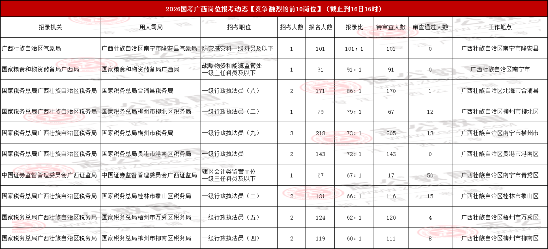 廣西區(qū)報(bào)名競(jìng)爭(zhēng)最激烈前十職位情況匯總
