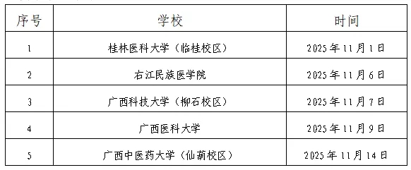 采取現(xiàn)場(chǎng)報(bào)名方式的人員請(qǐng)前往桂林醫(yī)科大學(xué)、右江民族醫(yī)學(xué)院、廣西科技大學(xué)、廣西醫(yī)科大學(xué)、廣西中醫(yī)藥大學(xué)等區(qū)內(nèi)各院校雙選會(huì)現(xiàn)場(chǎng)進(jìn)行應(yīng)聘。廣西區(qū)內(nèi)各院校雙選會(huì)舉辦時(shí)間詳見(jiàn)下表。