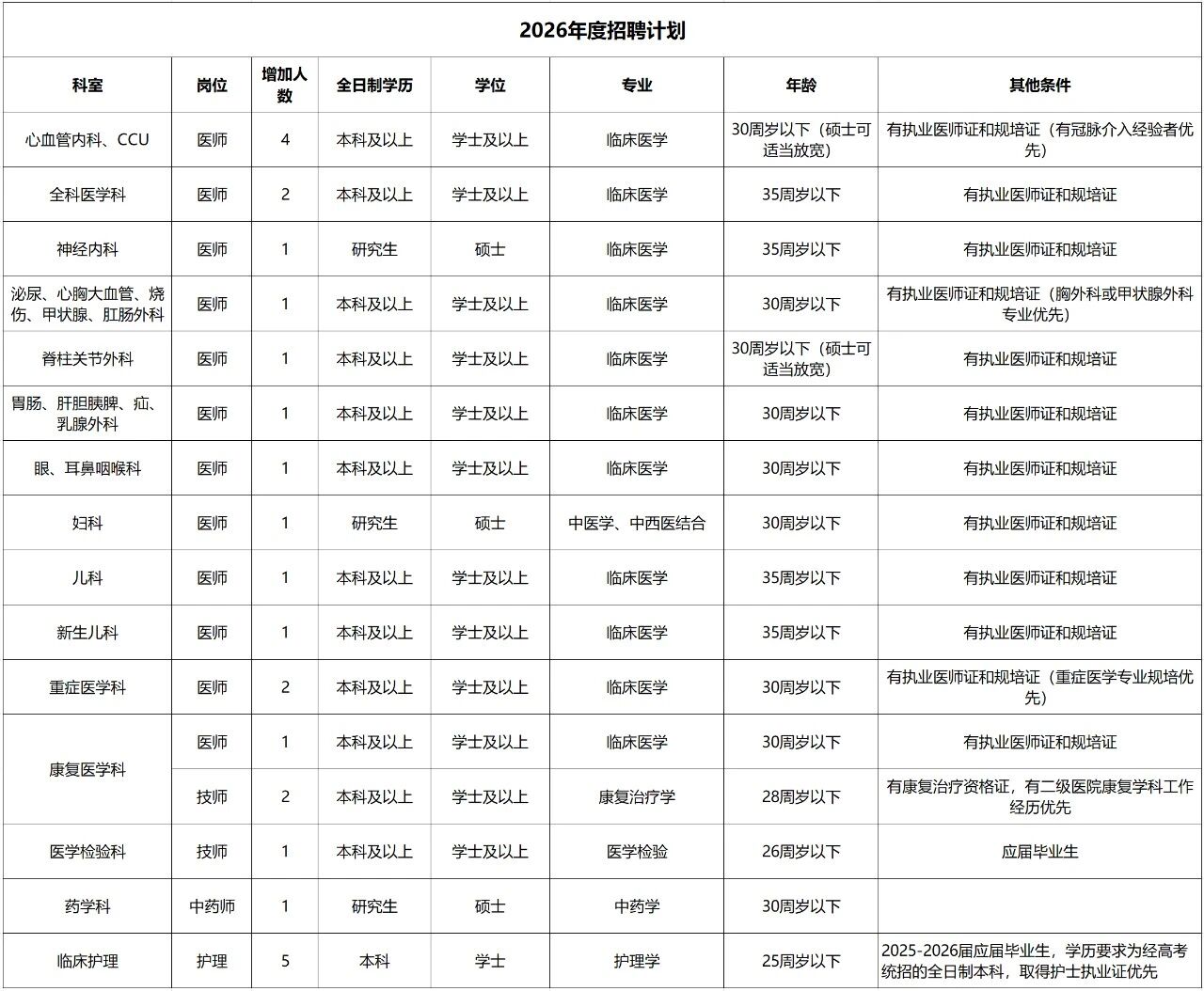 (二)醫(yī)院招聘的所有崗位均要求畢業(yè)時須同時取得應聘崗位所需的學歷、學位證,緊缺崗位可放寬學位條件。同時須取得住院醫(yī)師規(guī)范化培訓合格證書、醫(yī)師資格證書、醫(yī)師執(zhí)業(yè)證書。