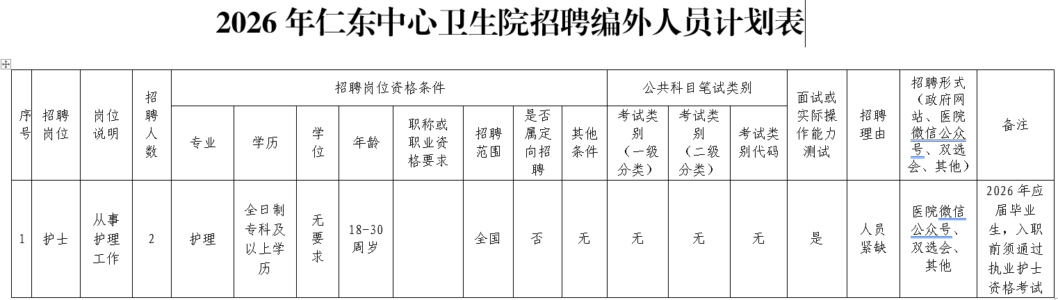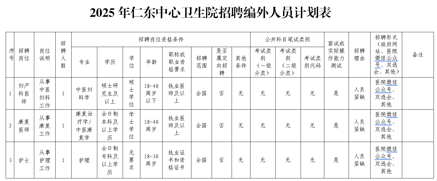7.學(xué)歷、專業(yè)及其他任職要求詳見仁東中心衛(wèi)生院招聘編外人員計(jì)劃表。