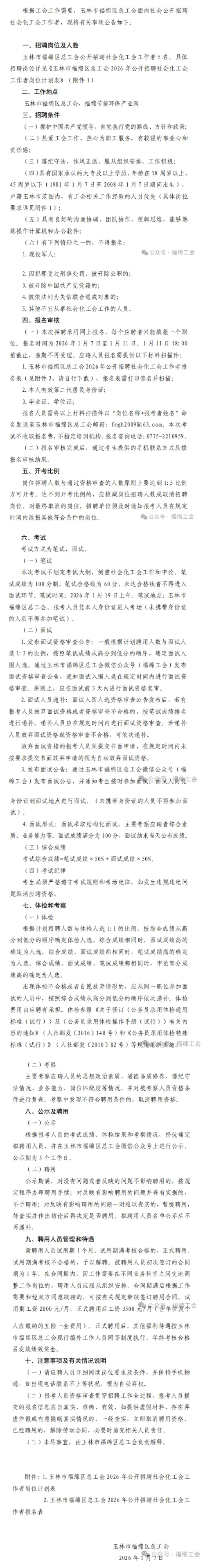 原文標題:2026年玉林市福綿區(qū)總工會面向社會公開招聘社會化工會工作者的公告