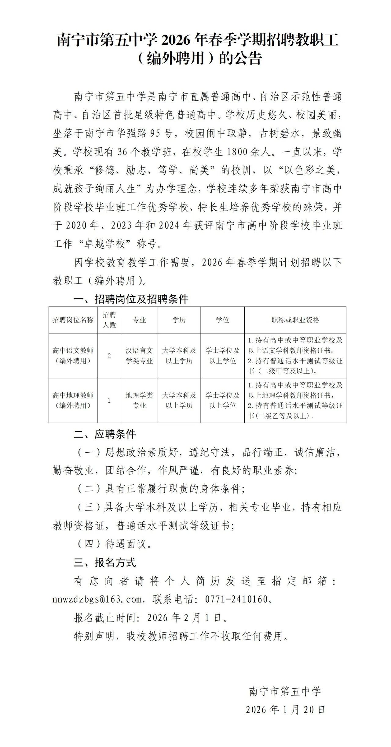 2026年春季學期南寧市第五中學招聘教職工3人