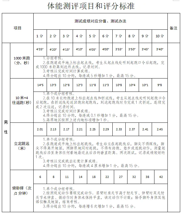 任一單項(xiàng)得分為0的視為“不合格”,予以淘汰。體能測評所有項(xiàng)目均只測試一次。(標(biāo)準(zhǔn)見附件)