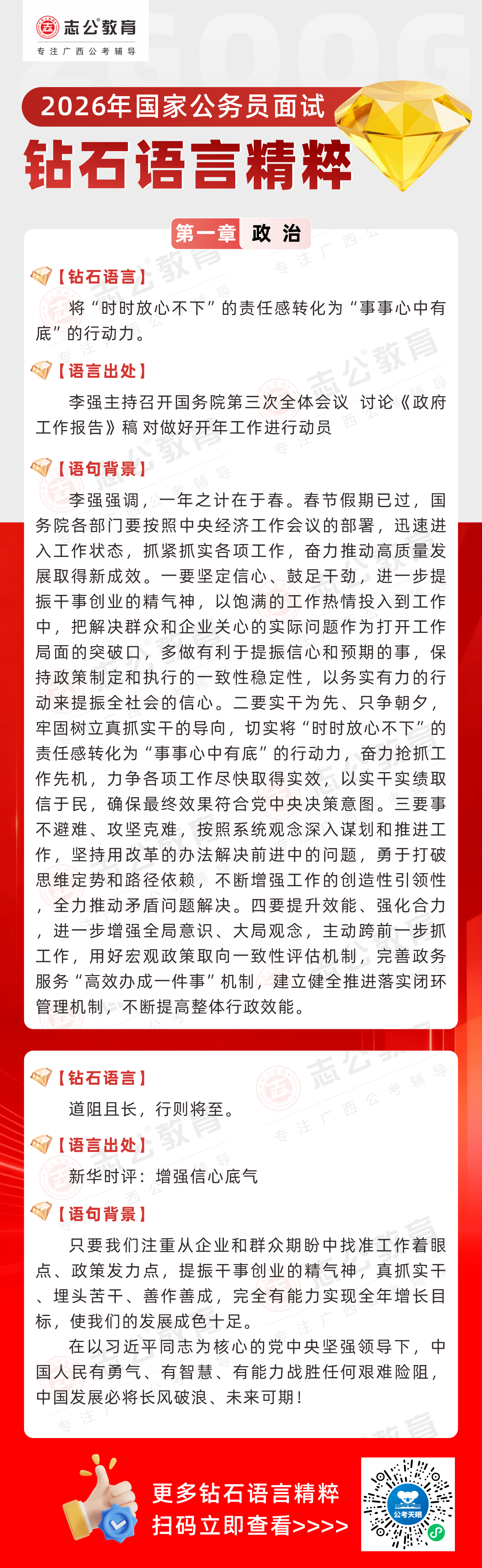 志公教育推出《2026國家公務(wù)員面試·鉆石語言精粹》政治篇!幫助考生把握政治類題目應(yīng)答邏輯,提升語言表達(dá)層次,助你在面試中脫穎而出。備考2026國考面試,從掌握“鉆石語言”開始!