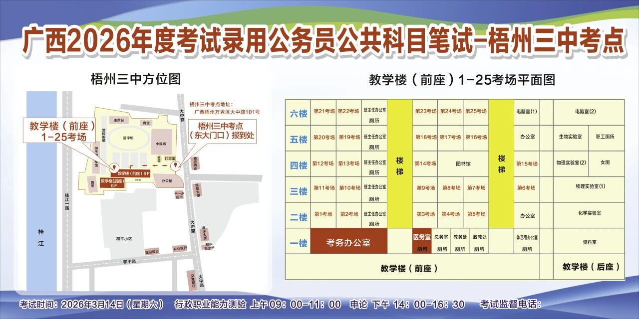 一、廣西2026年度考試錄用公務(wù)員(選調(diào)生)公共科目筆試將于3月14日舉行,梧州考區(qū)共設(shè)置10個(gè)考點(diǎn),請(qǐng)考生提前熟悉各自考點(diǎn)位置、周邊環(huán)境及交通情況,考試當(dāng)天提前出門(mén)做好準(zhǔn)備,準(zhǔn)時(shí)參加考試。