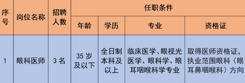 根據(jù)科室業(yè)務(wù)發(fā)展需要,面向社會(huì)公開招聘眼科醫(yī)師3名,具體崗位要求如下: