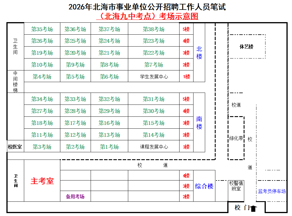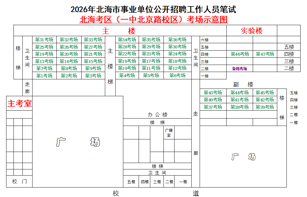 (一)3月28日進(jìn)行綜合管理類(A類)考試,北海市共設(shè)一個(gè)考點(diǎn),考點(diǎn)考場(chǎng)布置為: