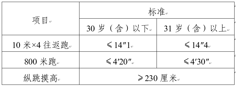 綜合管理類、執(zhí)法勤務類職位測查全部三個項目,三項全部達標方為合格;警務技術(shù)類職位免予測查1000米(男)/800米(女)跑項目,其他兩項全部達標方為合格;報考外語及少數(shù)民族語言翻譯緊缺職位的人員,體能測評三項中有兩項達標的,視為合格。